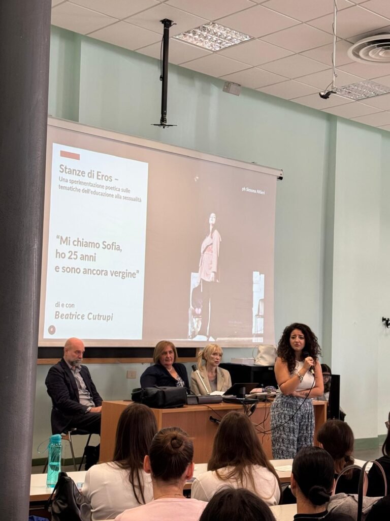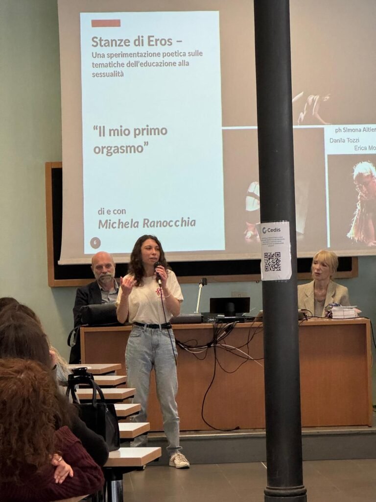 Durante gli interventi, dopo aver presentato a studenti e studentesse l’attivitĂ  della compagnia di arti sceniche, alcune attrici si esibiranno in estratti di monologhi dallo spettacolo Stanze di Eros, di nuovo in scena il 31 ottobre 2025 presso il Teatro Palladium di Roma.
