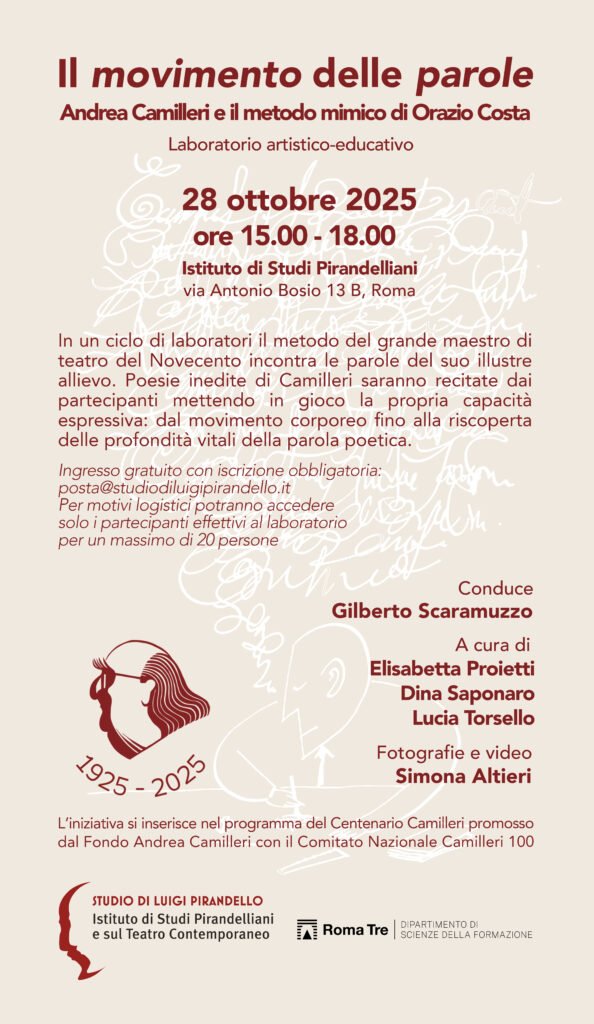 Le parole del giovanissimo Andrea Camilleri nella poesia dedicata a Federico Garcia Lorca (qui sopra se ne riporta uno stralcio) sono state il motivo conduttore del laboratorio ospitato dall’Istituto di Studi Pirandelliani e sul Teatro Contemporaneo. Variegati per età e provenienza, i venti partecipanti hanno avuto l’opportunità e l’emozione di sperimentare il metodo mimico del grande maestro di teatro Orazio Costa e di lavorare sul testo poetico di Camilleri all’interno dello studio di Luigi Pirandello, in quella che fu la residenza romana dello scrittore premio Nobel per la letteratura nel 1934. Un ringraziamento particolare va ad Annamaria Andreoli presidente dell’Istituto e a Dina Saponaro e Lucia Torsello.