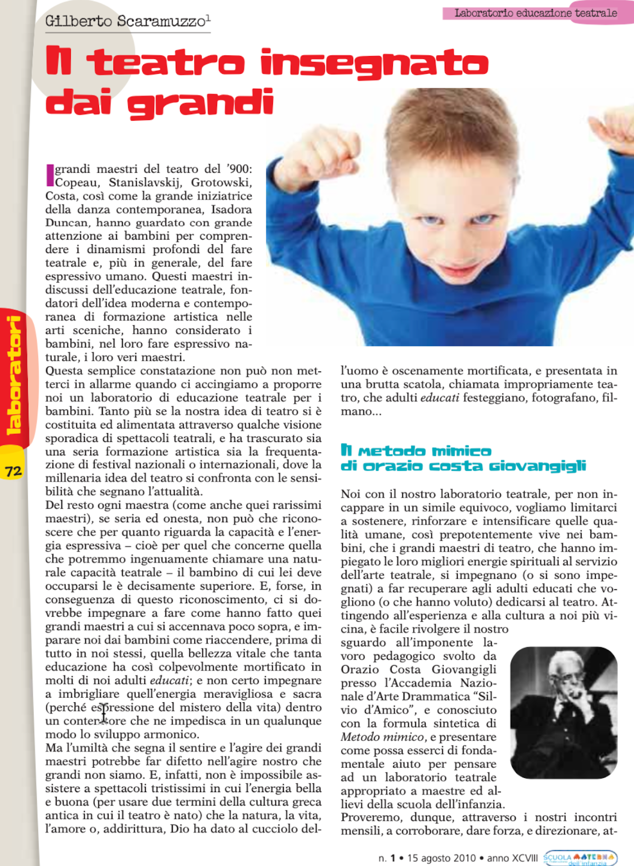 Il laboratorio di educazione teatrale proposto vuole rinforzare e intensificare quelle qualità umane, così prepotentemente vive nei bambini, che i grandi maestri di teatro si sono impegnati a far recuperare agli adulti educati che vogliono dedicarsi al teatro. In particolare, si ispira al lavoro pedagogico del maestro teatrale Orazio Costa Giovangigli, il Metodo mimico, evidenziando come esso possa essere di fondamentale aiuto per pensare e realizzare attività teatrali appropriate a maestre ed allievi della scuola dell’infanzia.