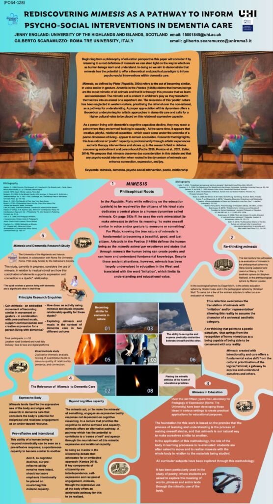 Questo studio, attualmente in corso, prende in considerazione l’uso di mimesis in relazione agli stimoli musicali e il modo in cui questa combinazione di elementi supporta l’espressione e la connessione in una relazione diadica (la diade coinvolge una persona affetta da demenza e una persona significativa nella sua vita).