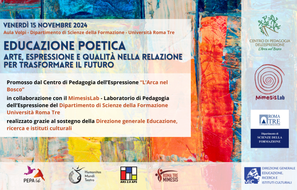 Il convegno “Educazione Poetica”, promosso dal Centro di Pedagogia dell’Espressione l’Arca nel Bosco e dal Mimesislab di Roma Tre e sostenuto della Direzione Generale Educazione, Ricerca e Istituti culturali del Ministero della Cultura, ha voluto indagare la relazione tra espressione artistica, bellezza, educazione e benessere personale, sociale ed ecologico.